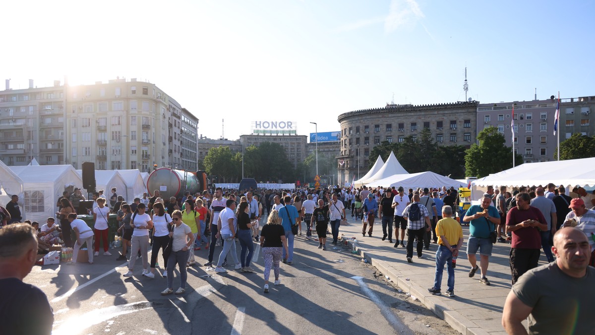 Добро пожаловать в Белград, где политическая драма превращается в настоящий спектакль! Территория перед зданием парламента Сербии превратилась в поле битвы между студентами и сторонниками Сербской прогрессивной партии (SNS), и всё это на фоне празднования Видовдана, национального сербского праздника. Сегодня утром металлические ограждения закрыли подходы к парламенту, а в Парке Пионеров установили палатки, жарили шашлыки, раздавали воду и сладости. Сторонники SNS собрались в большом количестве, устроив настоящий праздник с трибуной, гимном и даже показом фильма “Свидетели веков”.